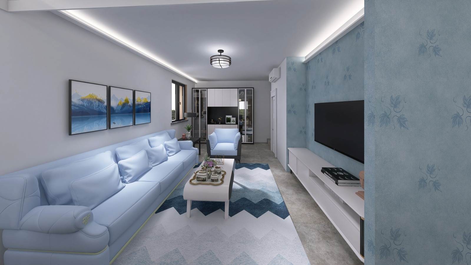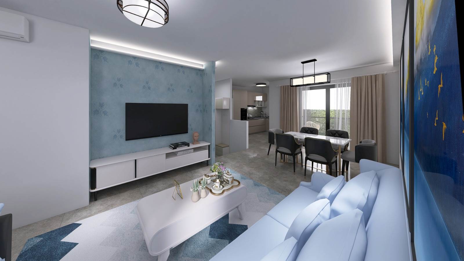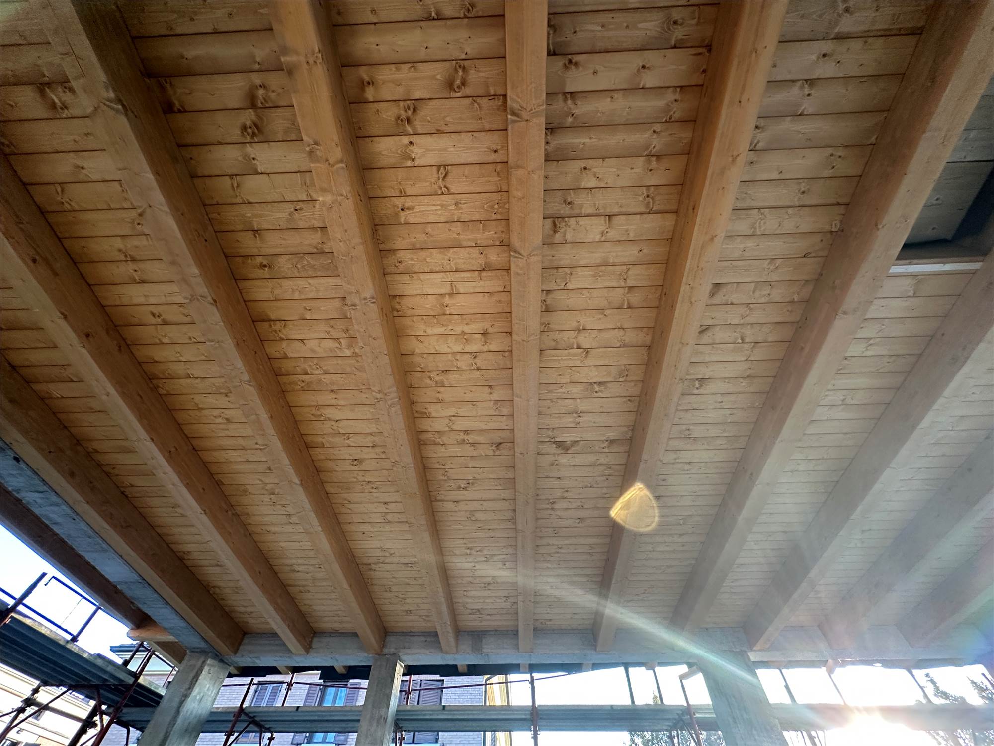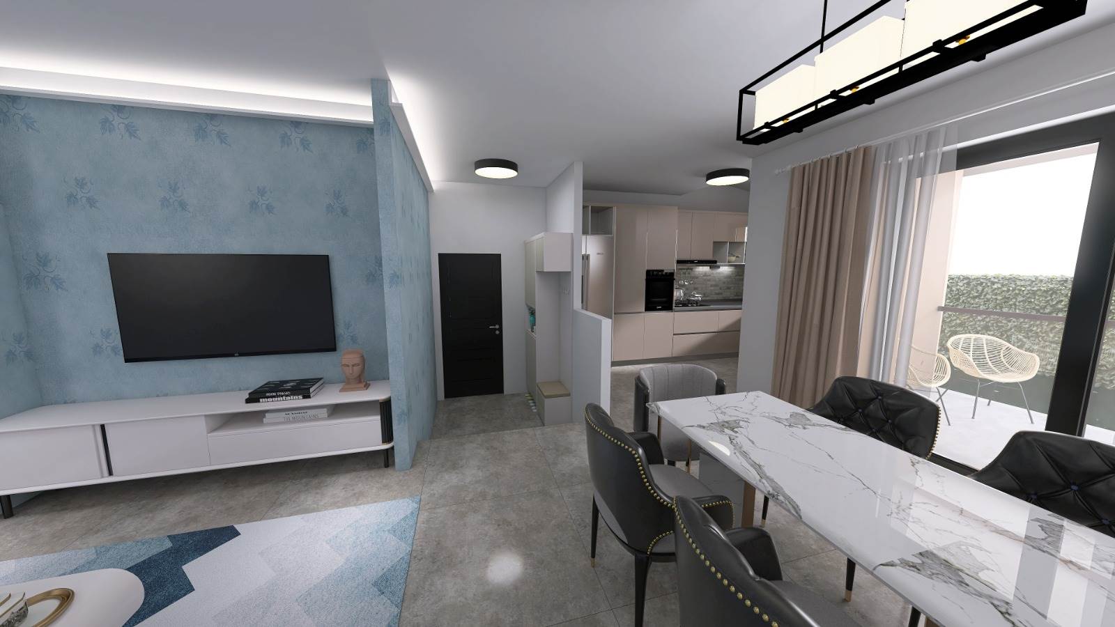 Loggia esterna coperta, collegata al salone da un infisso a scrigno, il quale conferisce continuità all'ambiente.